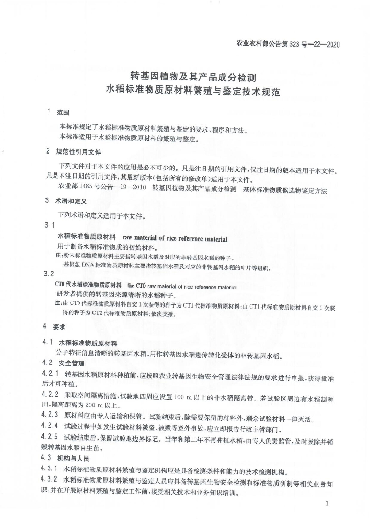 农业农村部公告第323号-22-2020 转基因植物及其产品成分检测 水稻标准物质原材料繁殖与鉴定技术规范