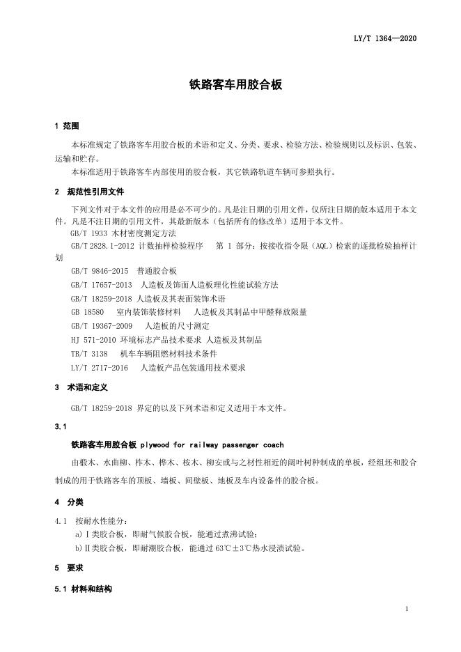 LY/T 1364-2020 铁路客车用胶合板