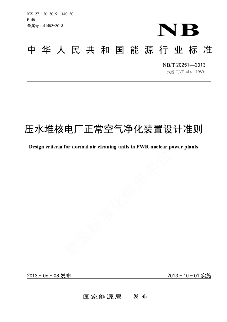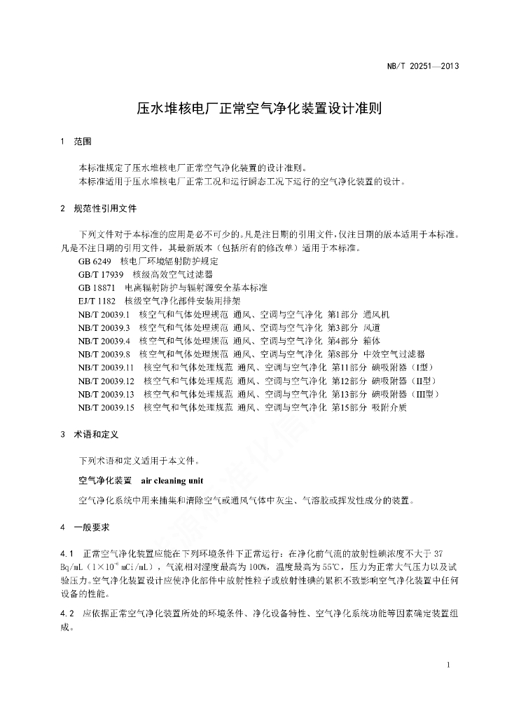 NB/T 20251-2013 压水堆核电厂正常空气净化装置设计准则