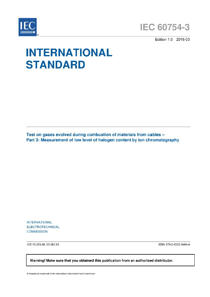 IEC 60754-3-2018 电缆材料燃烧过程中产生的气体测试 - 第3部分_低卤素含量的测量