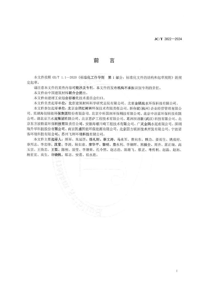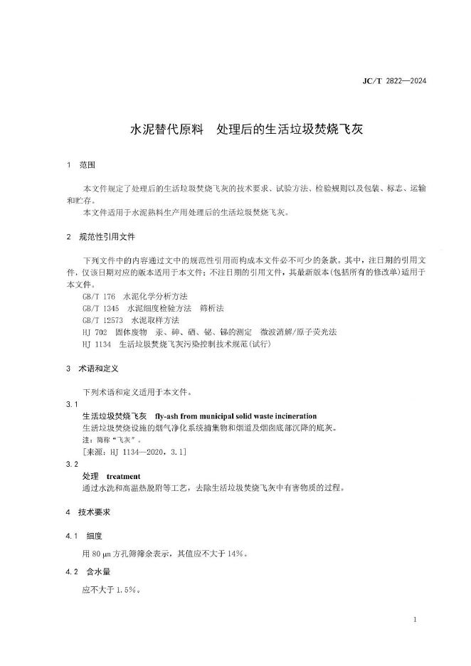 JC/T 2822-2024 水泥替代原料 处理后的生活垃圾焚烧飞灰