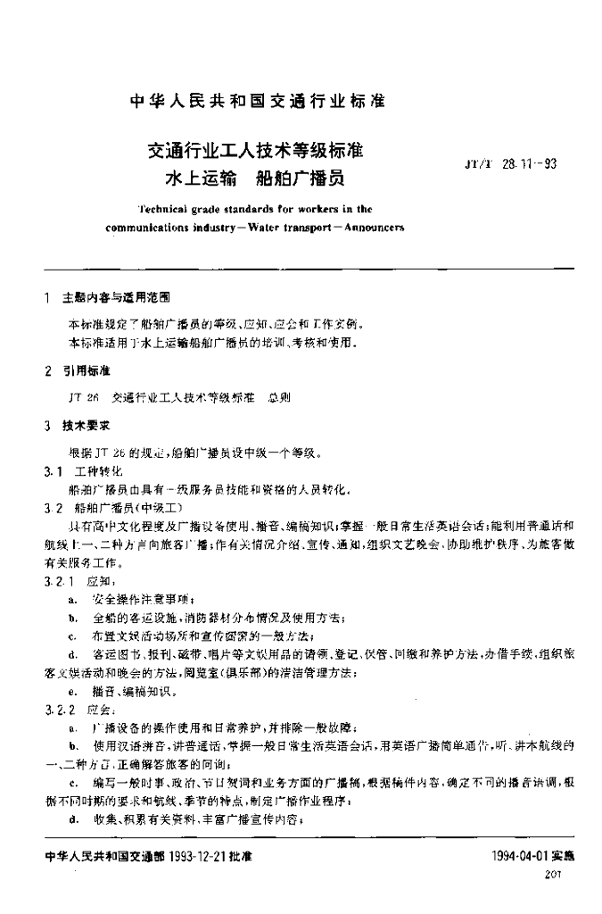 JT/T 28.11-1993 交通行业工人技术等级标准水上运输船舶广播员