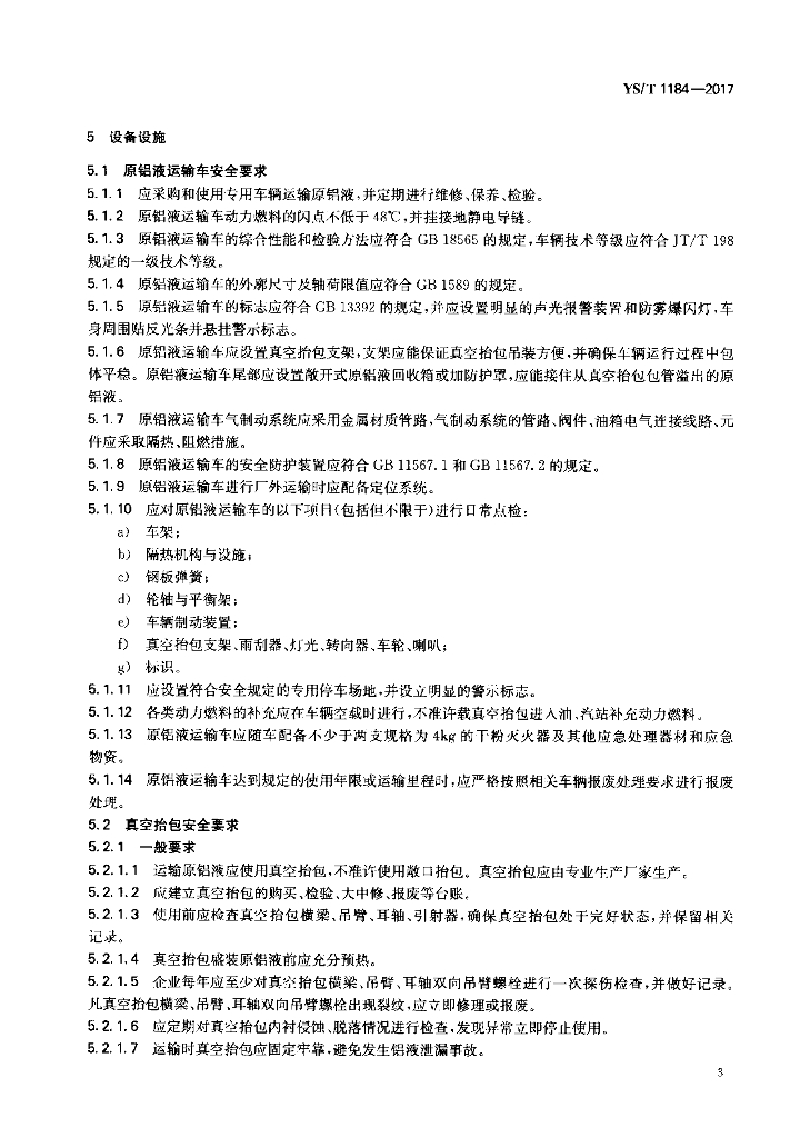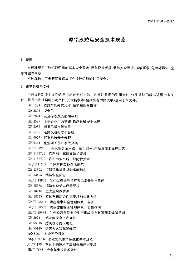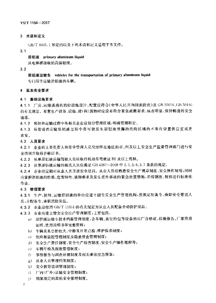 YS/T 1184-2017 原铝液贮运安全技术规范