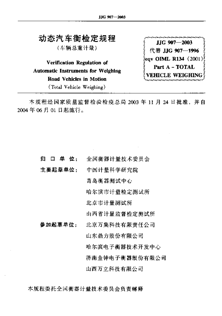 中国计量科学研究院、青岛衡器测试中心、哈尔滨市计量检定测试所、北京市计量测试所、山西省计量监督检定测试所、北京万集科技有限责任公司、山东鼎力股份有限公司、哈尔滨电子衡器技术开发中心、济南金钟电子衡器股份有限公司、山西万立科技有限公司