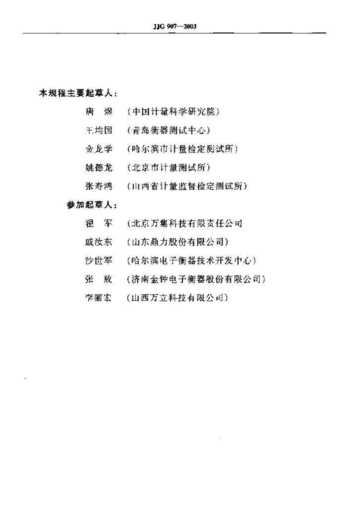 唐煜(中国计量科学研究院)、王均国(青岛衡器测试中心)、金龙学(哈尔滨市计量检定测试所)、姚德龙(北京市计量测试所)、张寿鸿(山西省计量监督检定测试所)、翟军(北京万集科技有限责任公司、戚汝东(山东鼎力股份有限公司)、沙世军(哈尔滨电子衡器技术开发中心)、张放(济南金钟电子衡器股份有限公司)、李丽宏(山西万立科技有限公司)