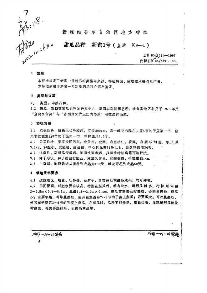 DB65/T 2391-1997 甜瓜品种 新密1号