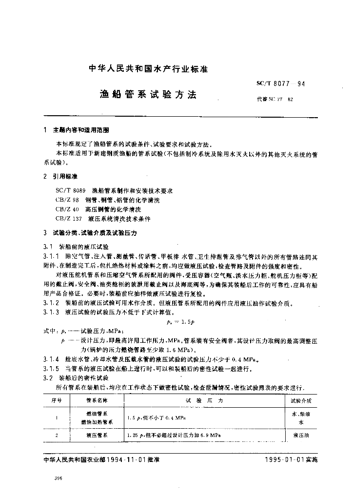 SC/T 8077-1994 渔船管系试验方法
