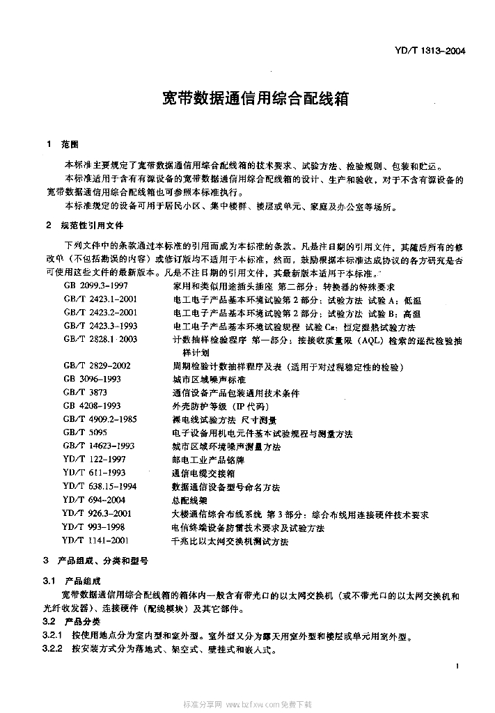 YD/T 1313-2004 宽带数据通信用综合配线箱