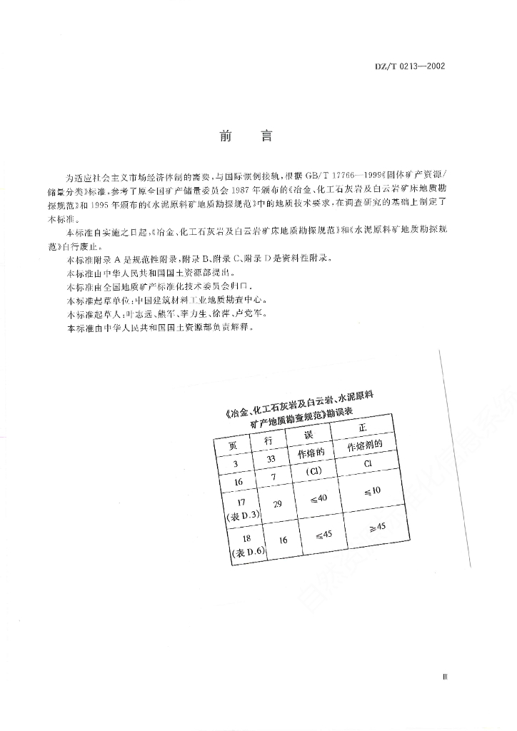DZ/T 0213-2002 冶金、化工石灰岩及白云岩、水泥原料矿产地质勘查规范
