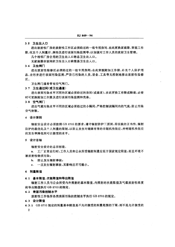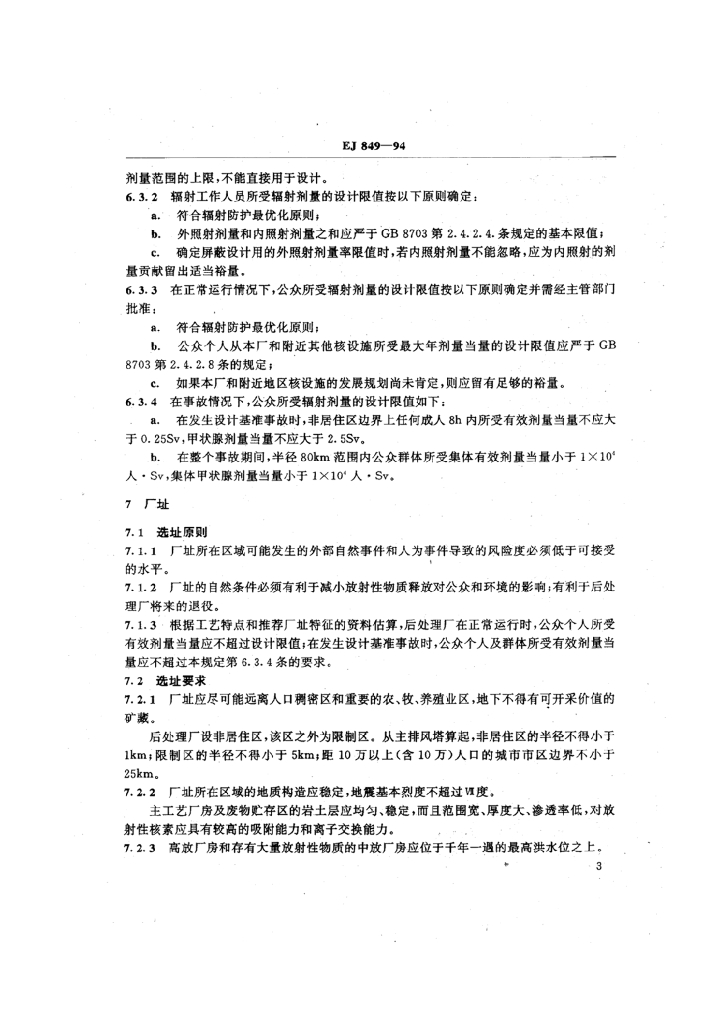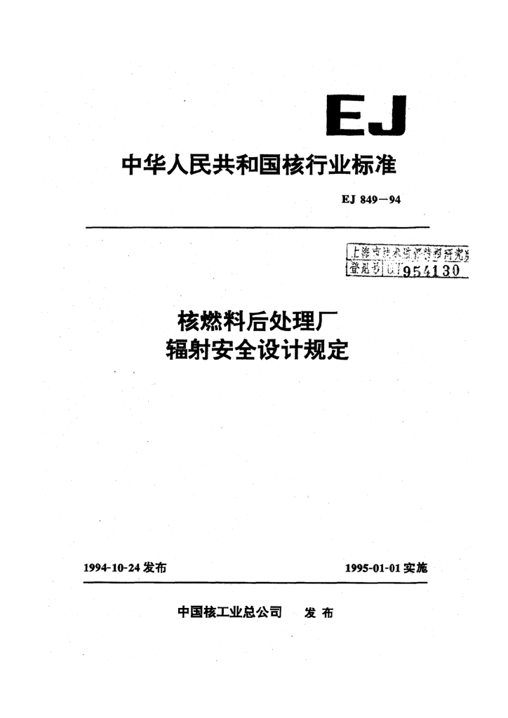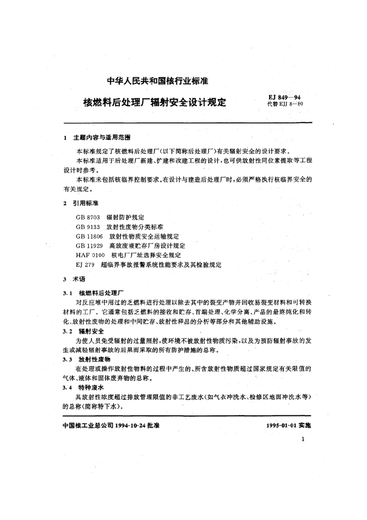 EJ/T 849-1994 核燃料后处理厂辐射安全设计规定