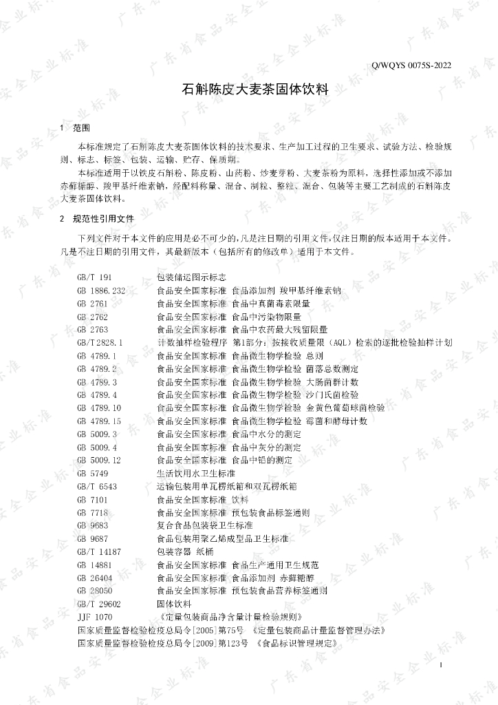Q/WQYS 0075S-2022 石斛陈皮大麦茶固体饮料