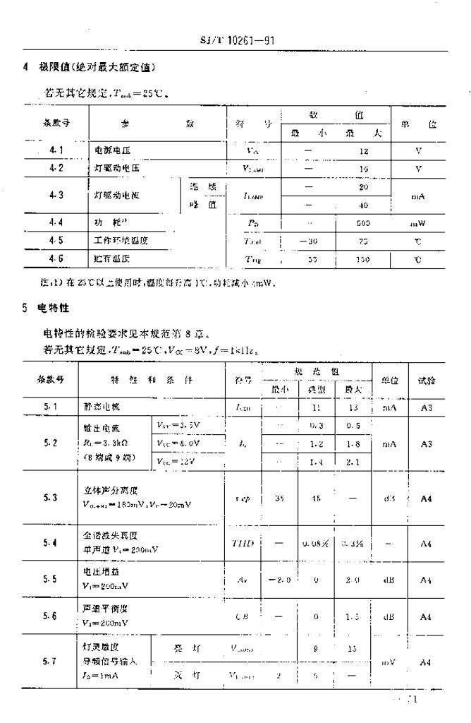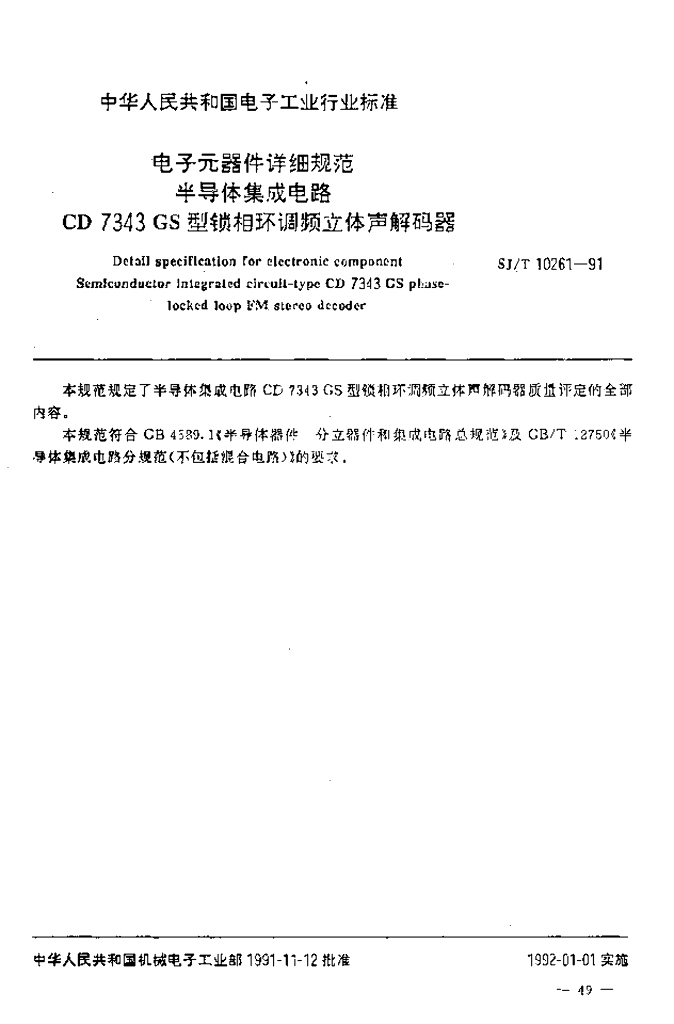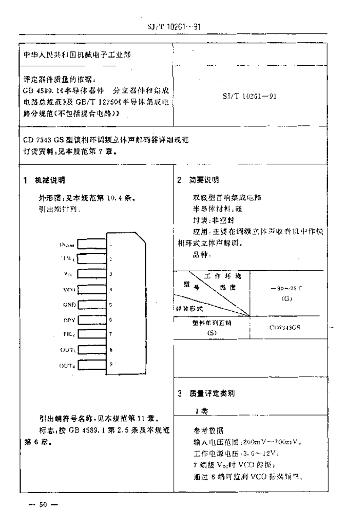 SJ/T 10261-1991 电子元器件详细规范 半导体集成电路CD7343GS型锁相环调频立体声解码器