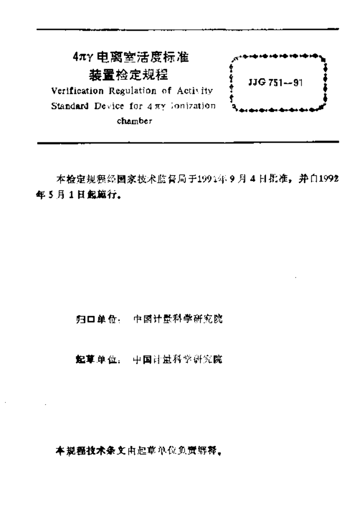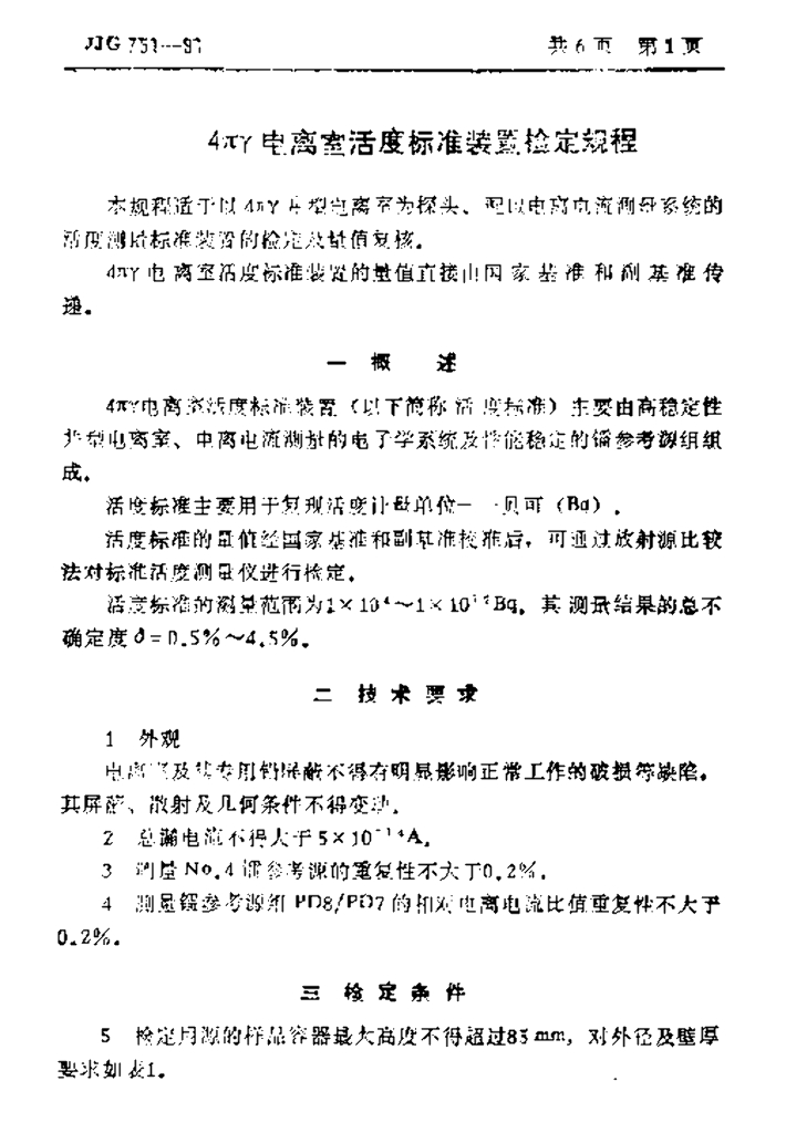 JJG 751-1991 4πγ电离室活度标准装置检定规程