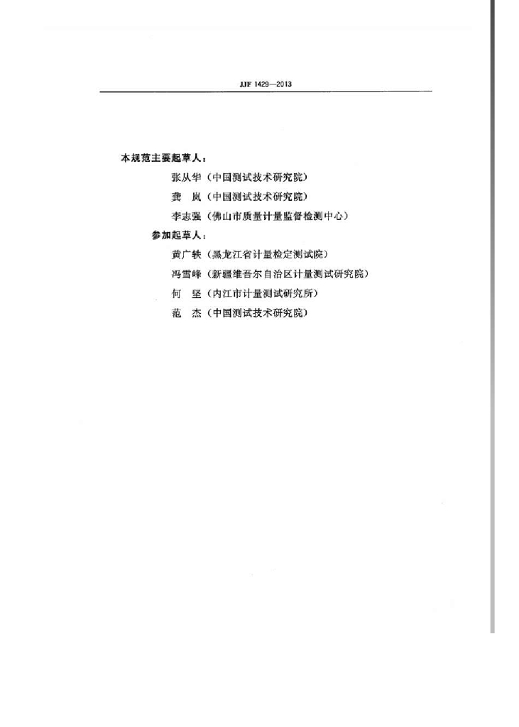 张从华(中国测试技术研究院)、龚岚(中国测试技术研究院)、李志强(佛山市质量计量监督检测中心)、黄广铁(黑龙江省计量检定测试院)、冯雪峰(新疆维吾尔自治区计量测试研究院)、何坚(内江市计量测试研究所)、范杰(中国测试技术研究院)