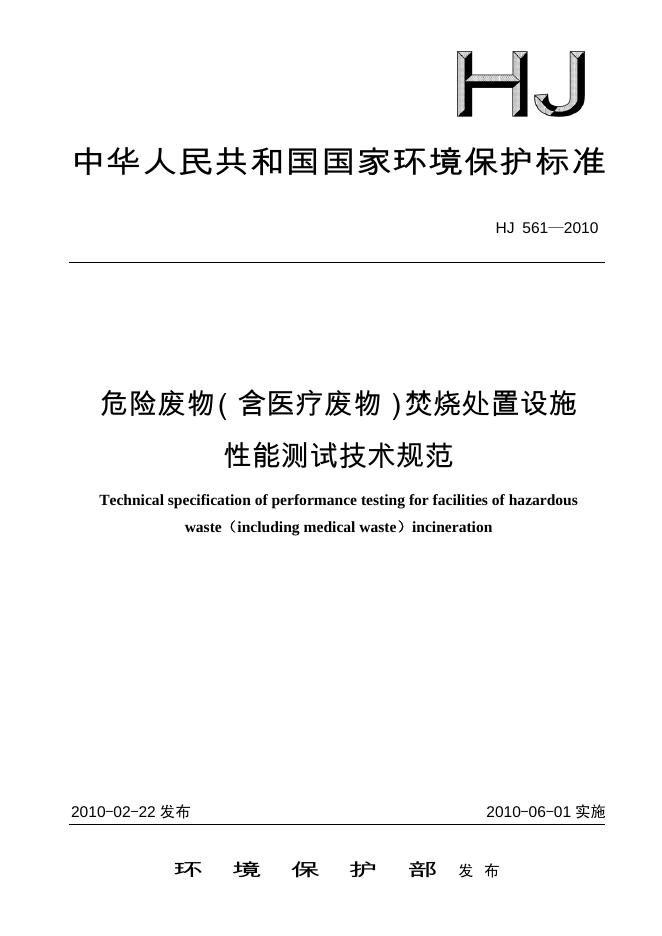 HJ 561-2010 危险废物(含医疗废物)焚烧处置设施性能测试技术规范