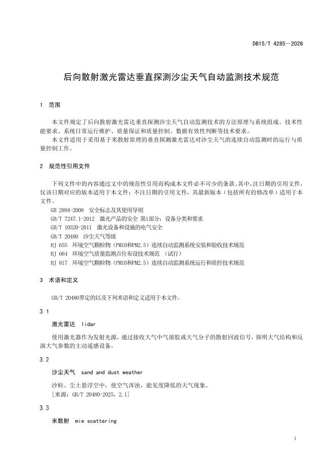 DB15/T 4285-2026 后向散射激光雷达垂直探测沙尘天气自动监测技术规范