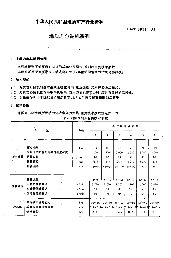 DZ/T 0051-1993 地质岩心钻机系列