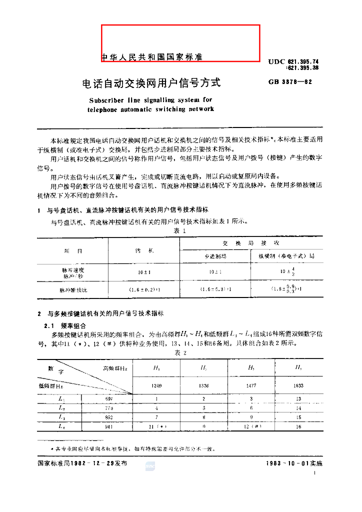 GB/T 3378-1982 电话自动交换网用户信号方式