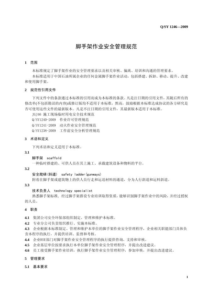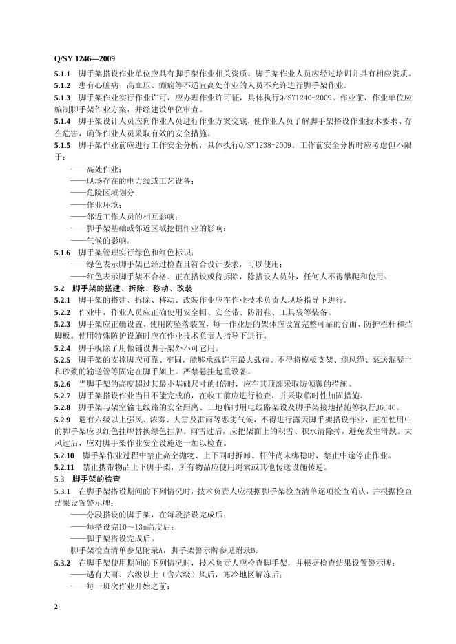 Q/SY 1246-2009 脚手架作业安全管理规范