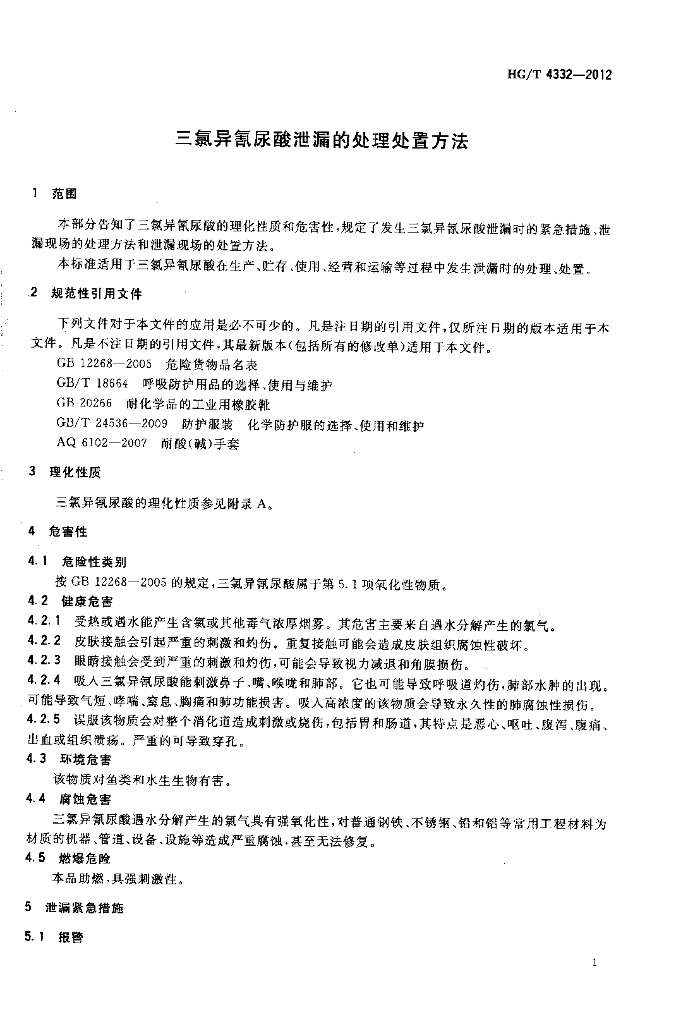 HG/T 4332-2012 三氯异氰尿酸泄漏的处理处置方法