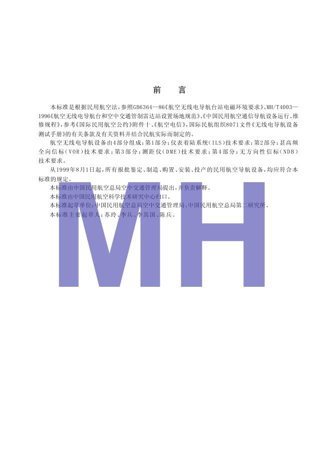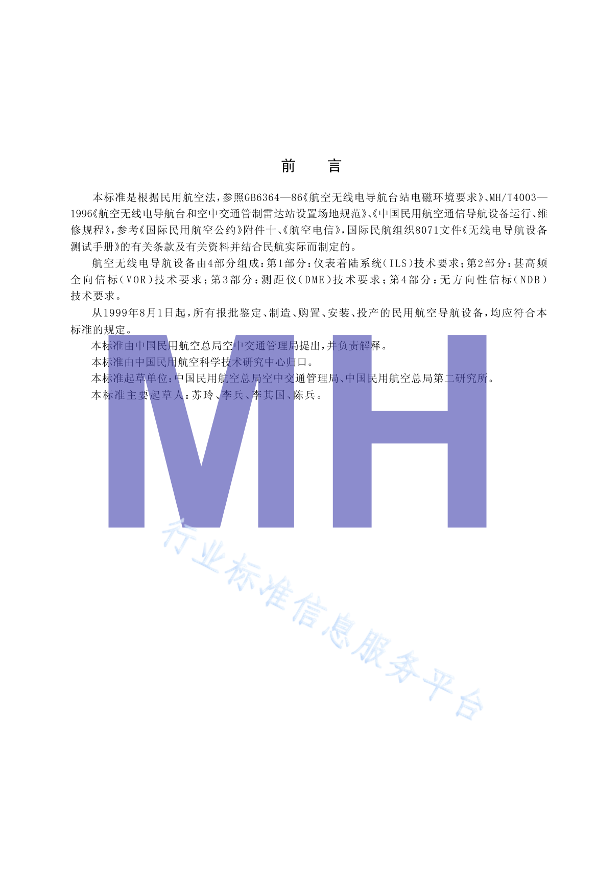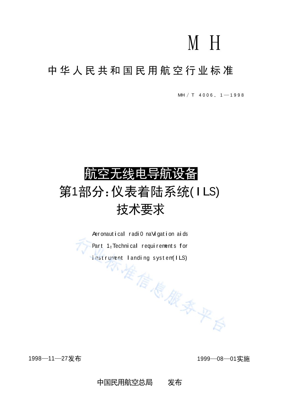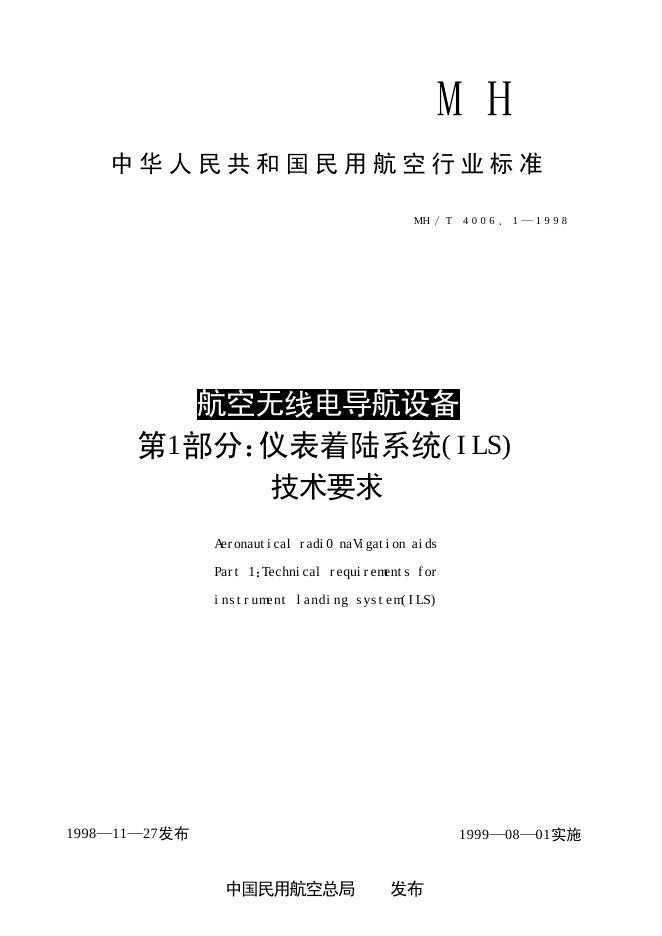 MH/T 4006.1-1998 航空无线电导航设备 第1部分:仪表着陆系统(ILS)技术要求