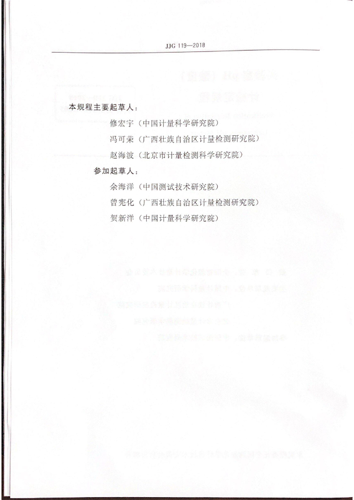修宏宇(中国计量科学研究院)、冯可荣(广西壮族自治区计量检测研究院)、赵海波(北京市计量检测科学研究院)、余海洋(中国测试技术研究院)、曾宪化(广西壮族自治区计量检测研究院)、贺新洋(中国计量科学研究院)
