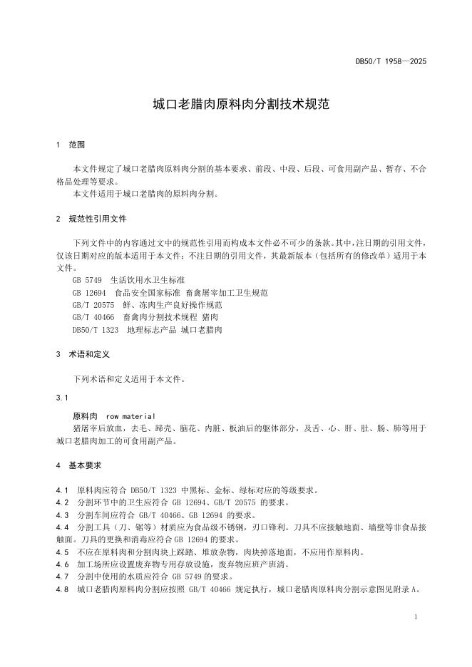 DB50/T 1958-2025 城口老腊肉原料肉分割技术规范