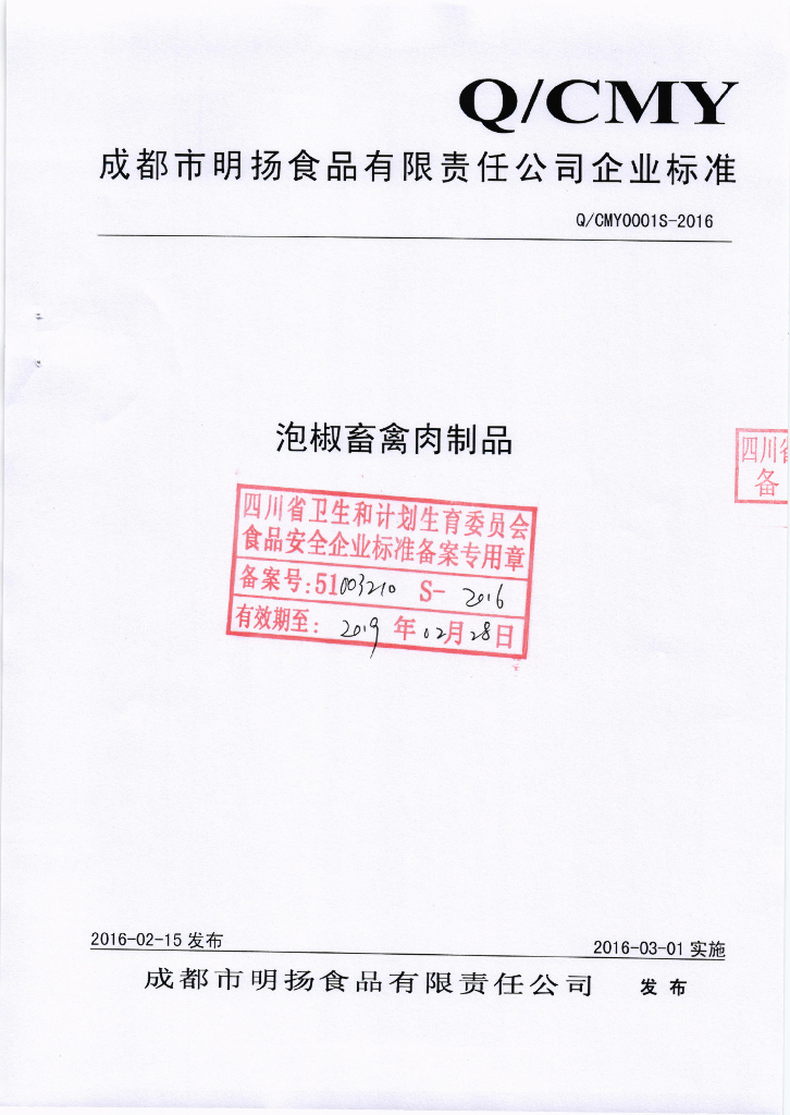 Q/CMY 0001S-2016 成都市名扬食品有限责任公司 泡椒畜禽肉制品