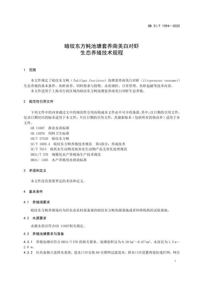 DB31/T 1594-2025 暗纹东方鲀池塘套养南美白对虾生态养殖技术规程