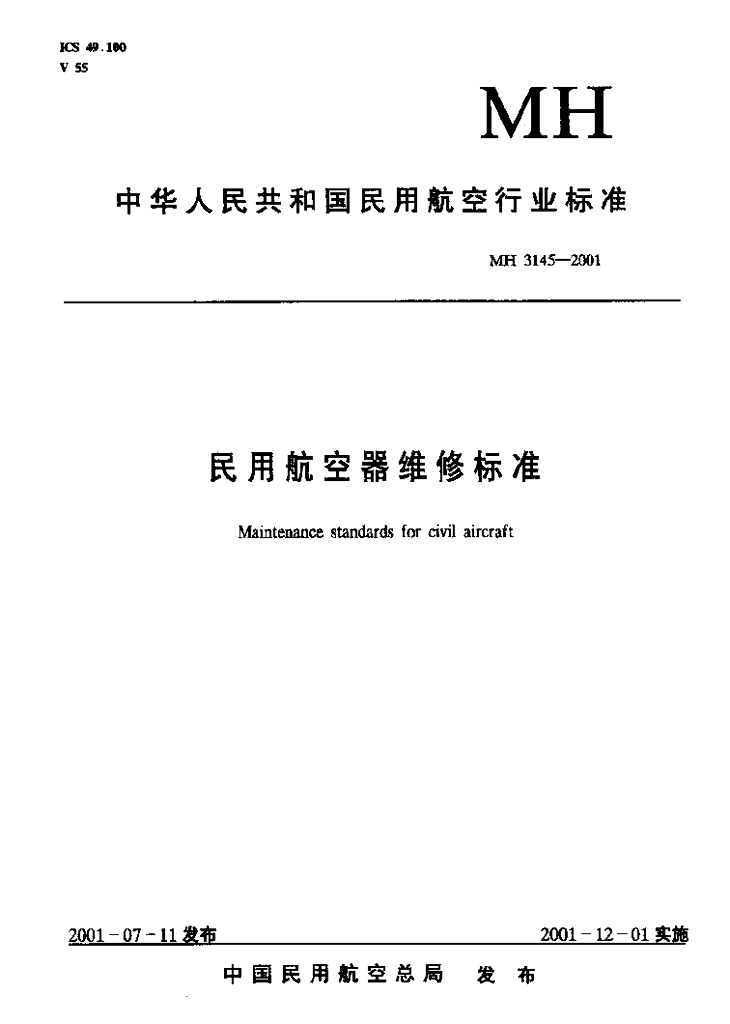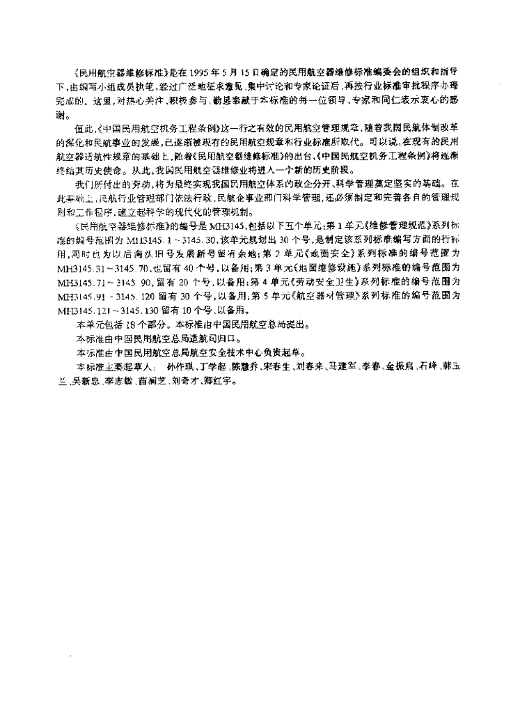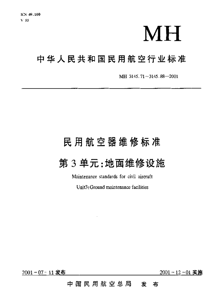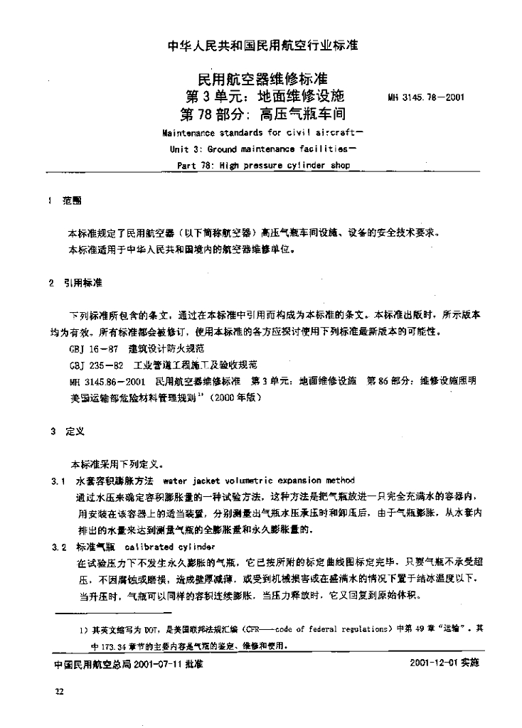 MH 3145.78-2001 民用航空器维修标准 第3单元 地面维修设施 第78部分 高压气瓶车间