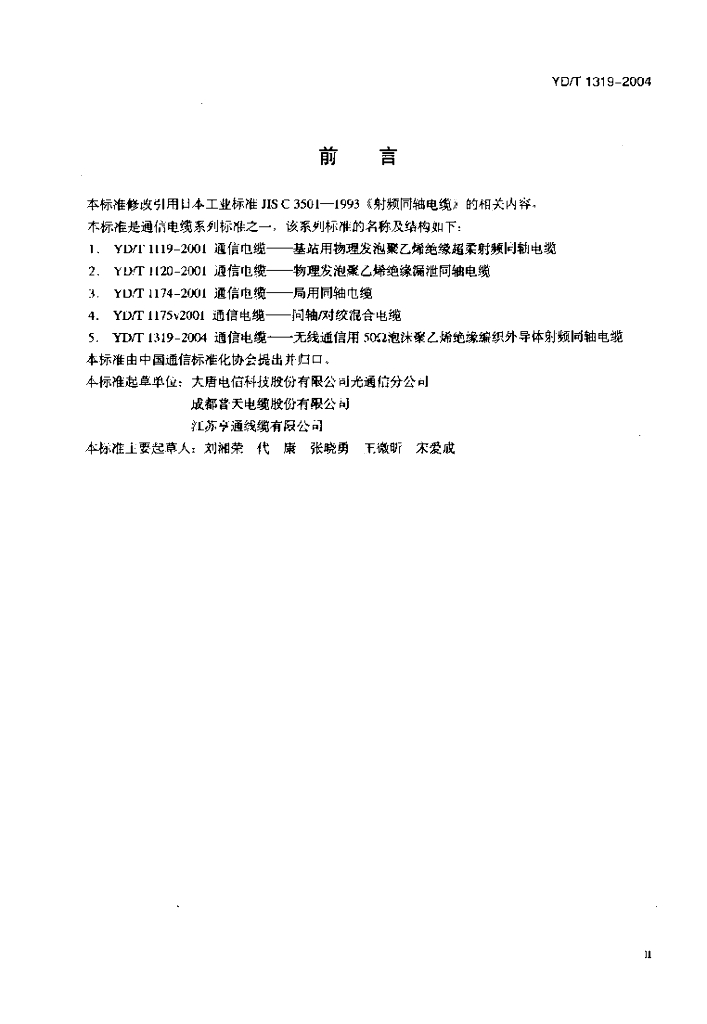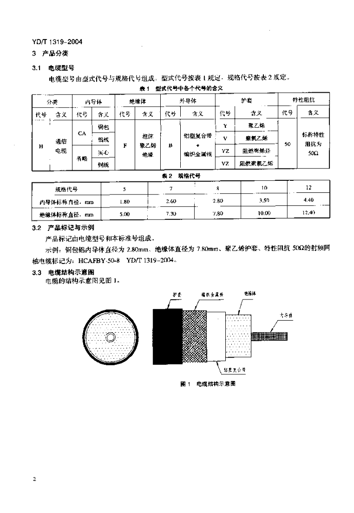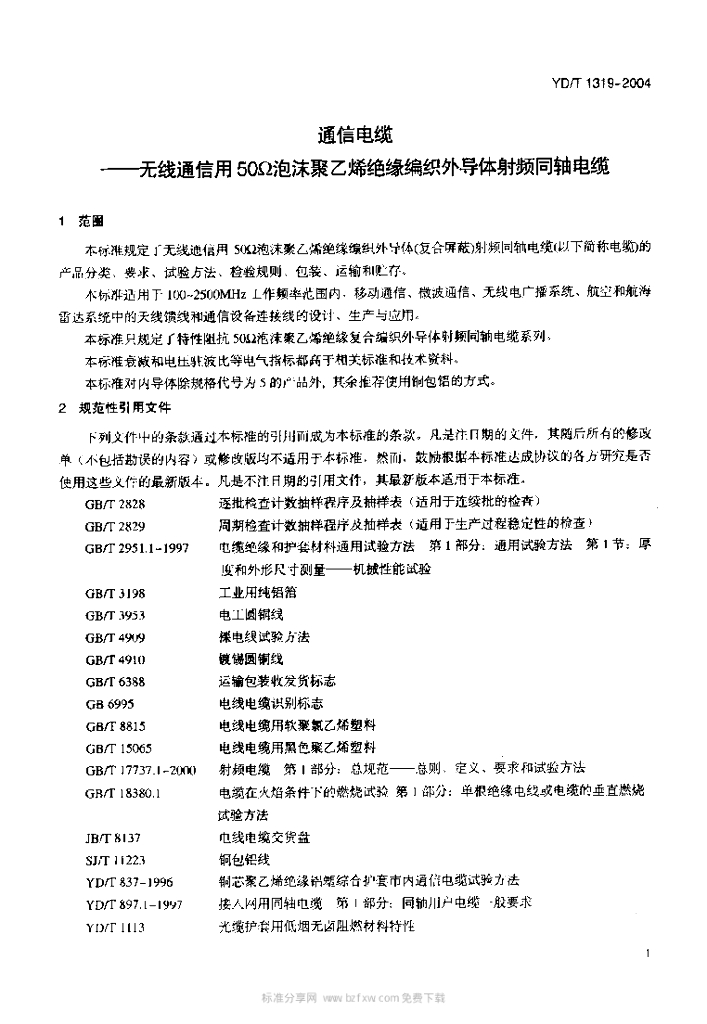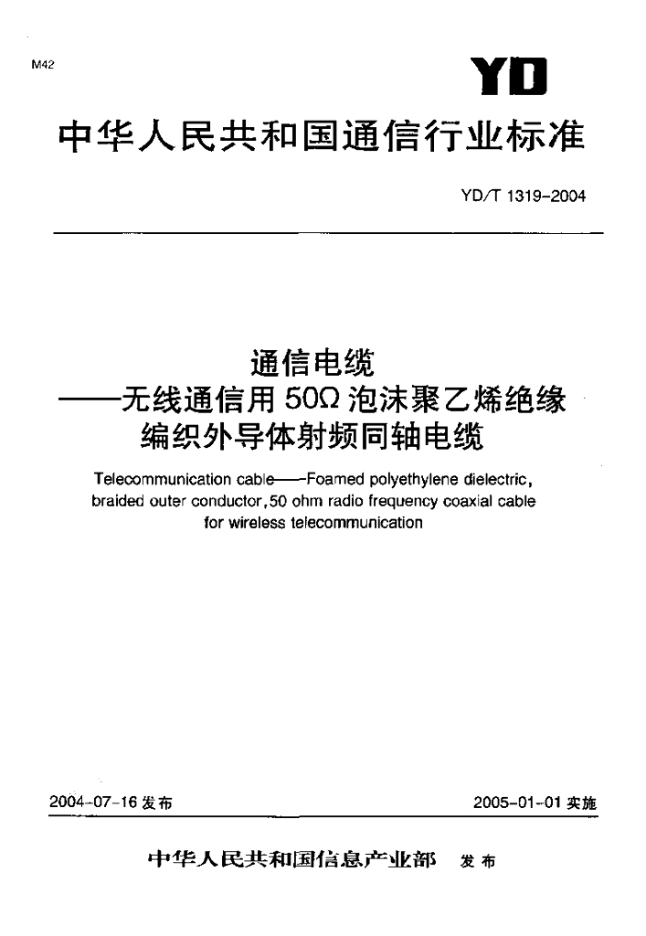 YD/T 1319-2004 通信电缆——无线通信用 50Ω 泡沫聚乙烯绝缘编织外导体射频同轴电缆