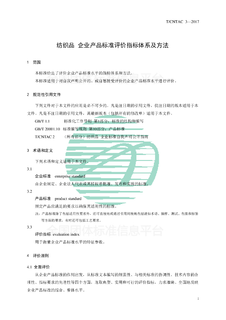 T/CNTAC 3-2017 纺织品 企业产品标准评价指标体系及方法