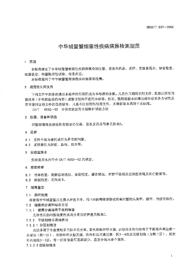DB32/T 937-2006 中华绒螯蟹细菌性疾病病原检测规范