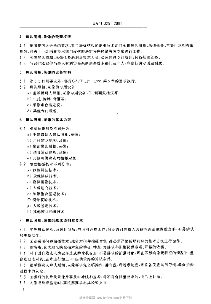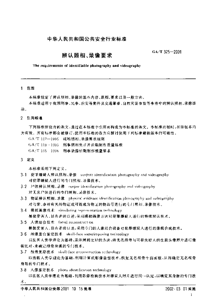 GA/T 325-2001 辨认照相、录像要求