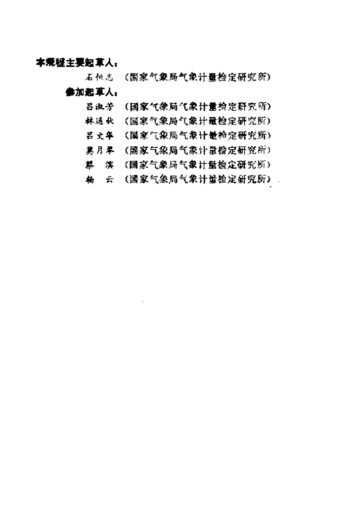 石恒志(国家气象局气象计量检定研究所)、吕淑芳(国家气象局气象计量检定研究所)、林逸秋(国家气象局气象计量检定研究所)、吕文华(国家气象局气象计量检定研究所)、莫月琴(国家气象局气象计量检定研究所)、蔡滨(国家气象局气象计量检定研究所)、杨云(国家气象局气象计量检定研究所)