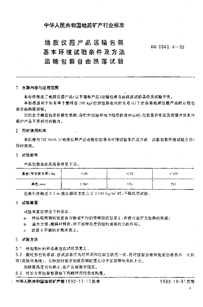 DZ 0040.4-1992 地质仪器产品运输包装基本环境试验条件及方法 运输包装自由跌落试验