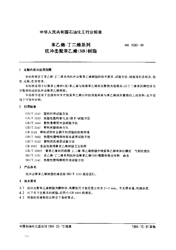 SH/T 1590-1994 苯乙烯-丁二烯系列抗冲击聚苯乙烯(SB)树脂