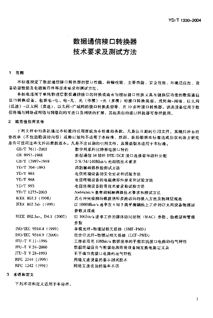 YD/T 1330-2004 数据通信接口转换器技术要求及测试方法