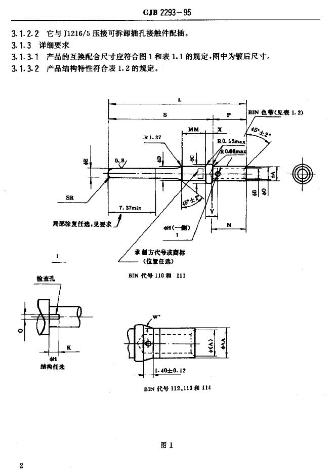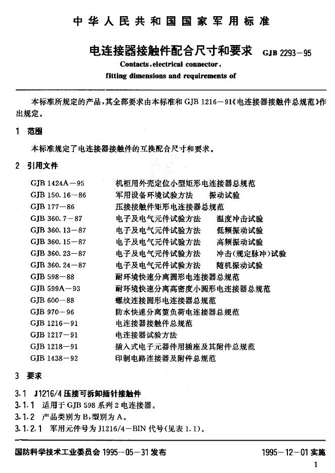 GJB 2293-1995 电连接器接触件配合尺寸和要求