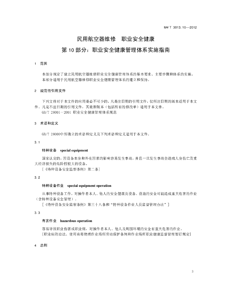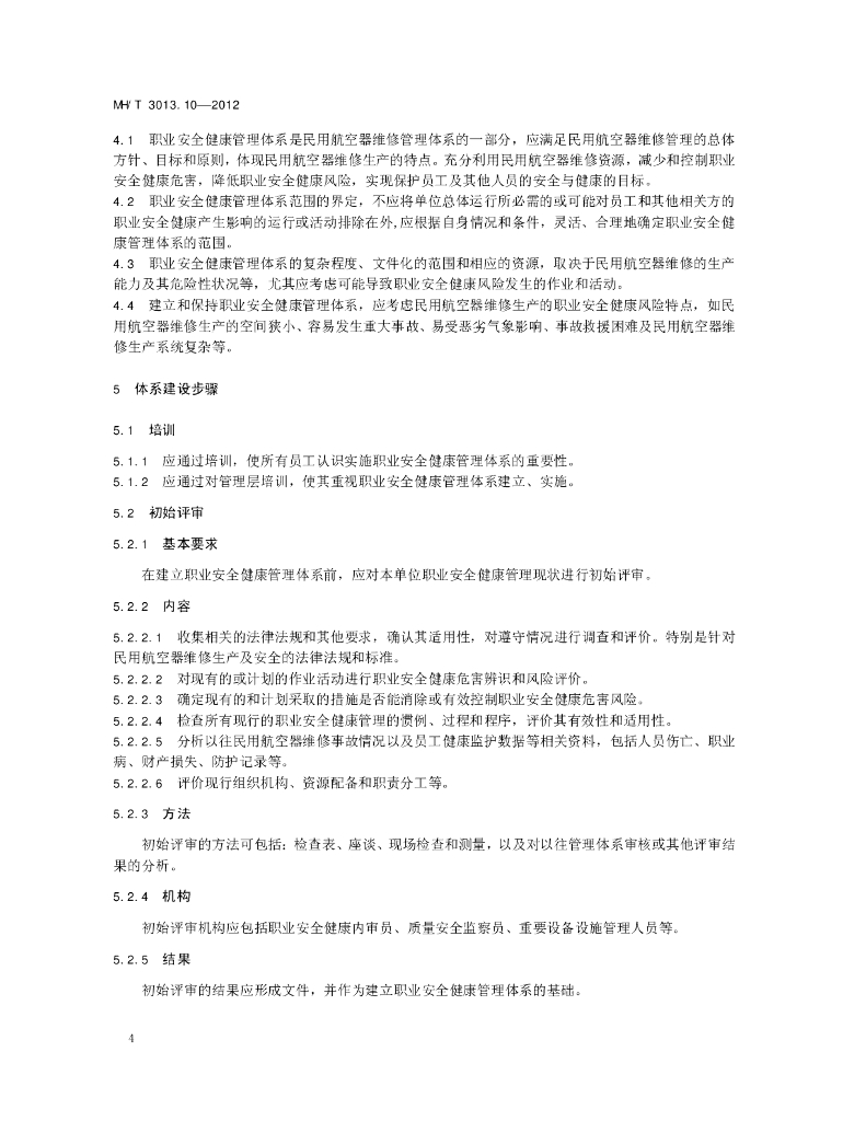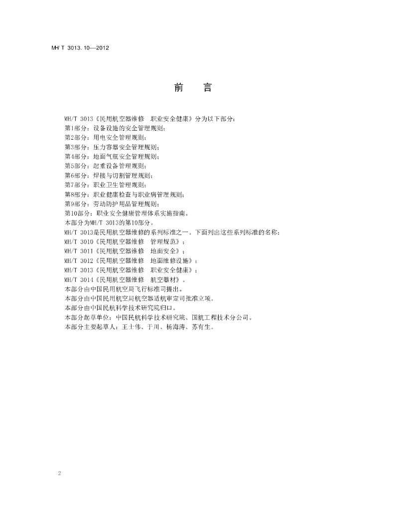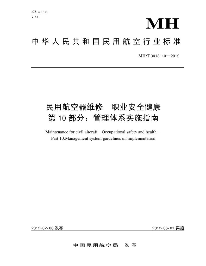 MH/T 3013.10-2012 民用航空器维修 职业安全健康 第10部分:管理体系实施指南