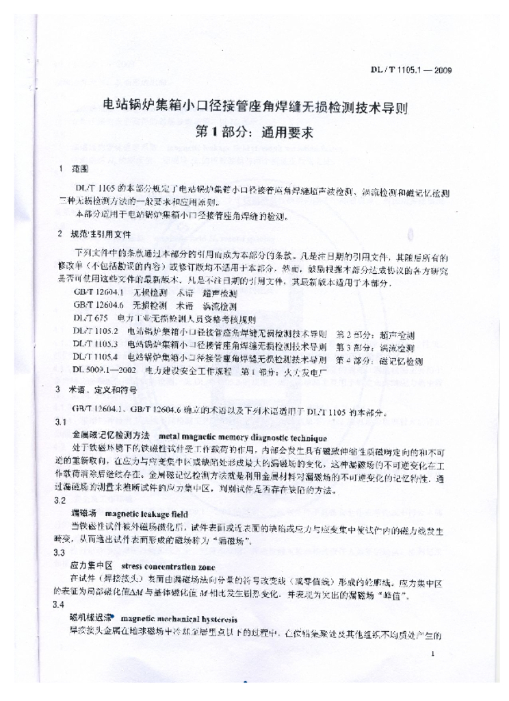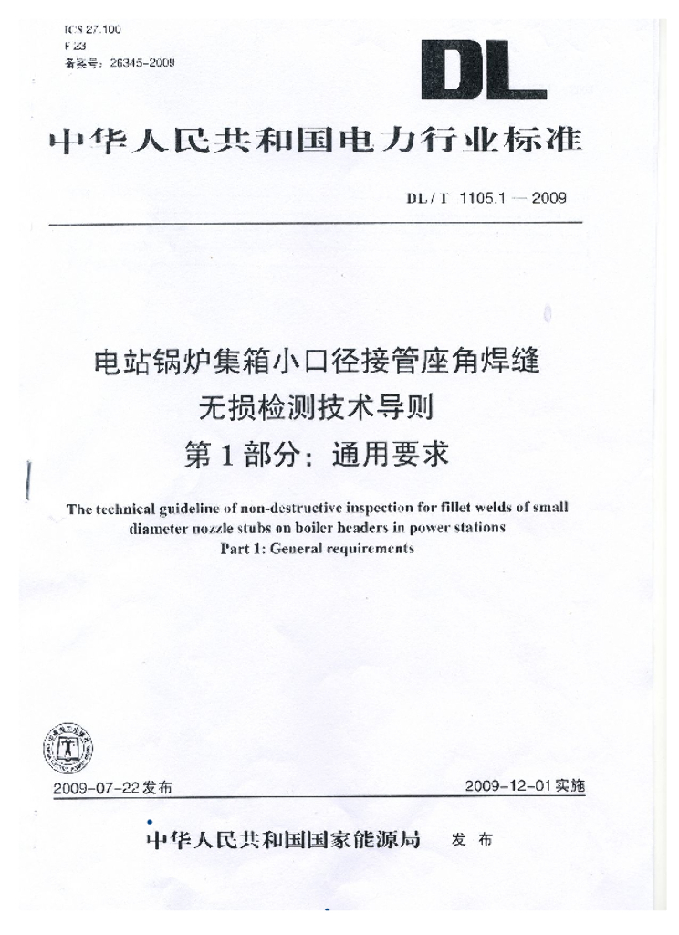 DL/T 1105.1-2009 电站锅炉集箱小口径接管座角焊缝 无损检测技术导则 第1部分:通用要求