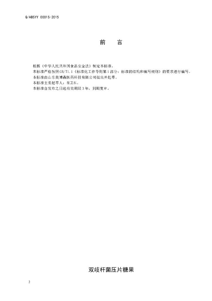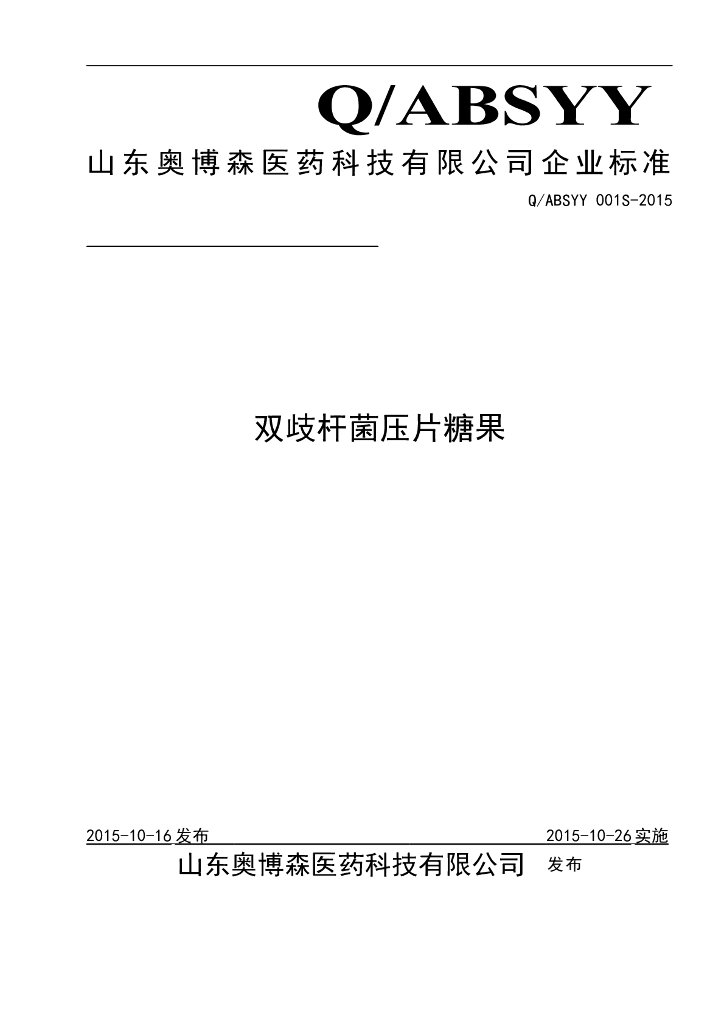 Q/ABSYY 001S-2015 山东奥博森医药科技有限公司 双歧杆菌压片糖果
