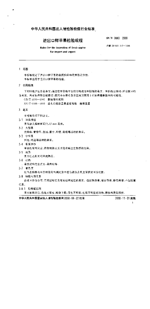 SN/T 0883-2000 进出口鲜苹果检验规程