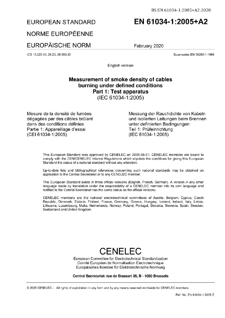 BS EN 61034-1:2005+A2:2020 电缆在特定条件下燃烧的烟密度测定 第1部分 试验装置