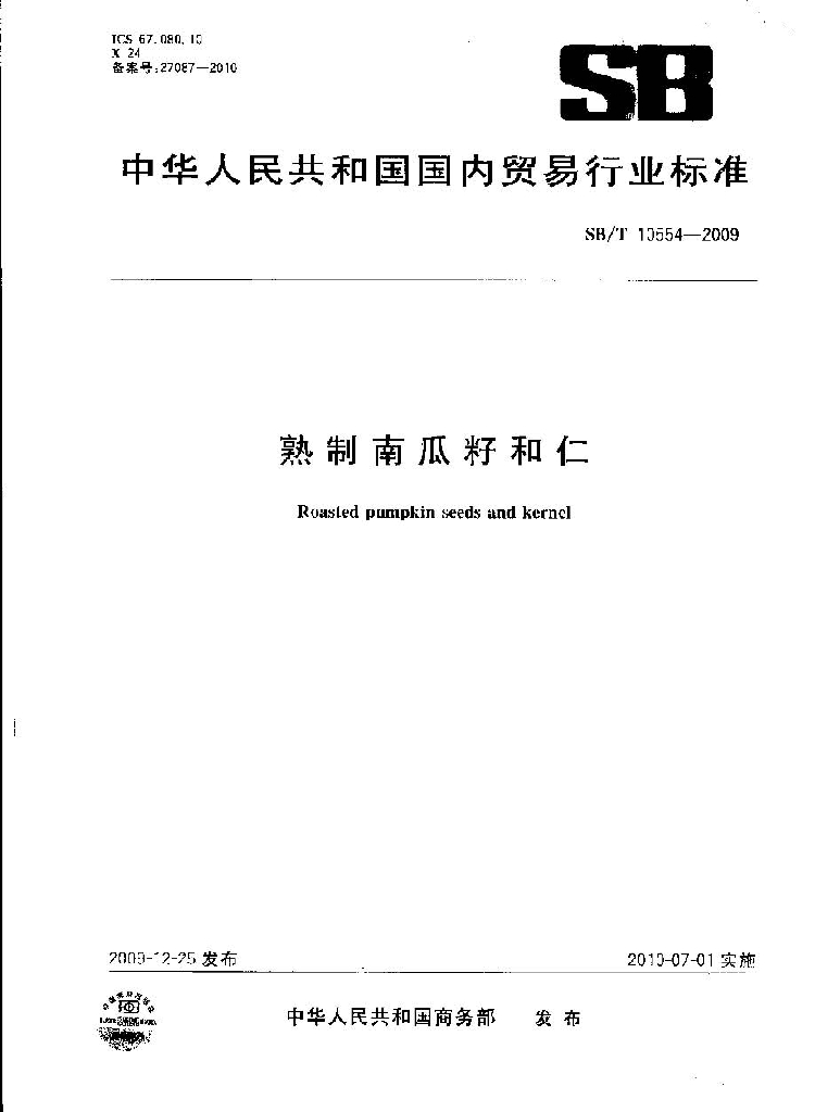 SB/T 10554-2009 熟制南瓜籽和仁