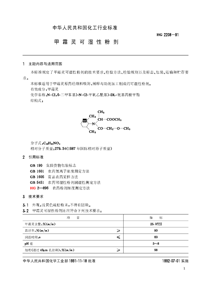 HG 2208-1991 甲霜灵可湿性粉剂
