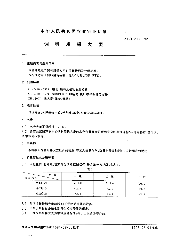 NY/T 210-1992 饲料用裸大麦