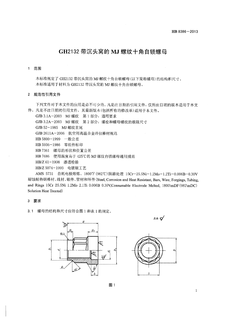HB 8386-2013 GH2132带沉头窝的MJ螺纹十角自锁螺母