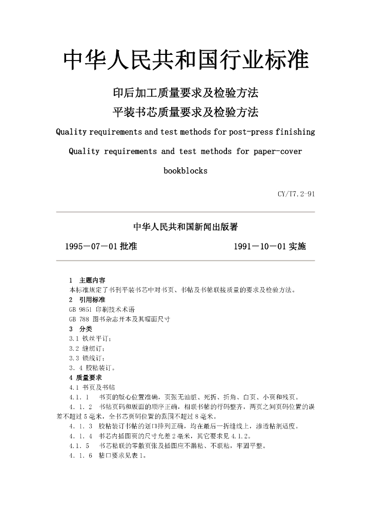 CY/T 7.2-1991 印后加工质量要求及检验方法 平装书芯质量要求及检验