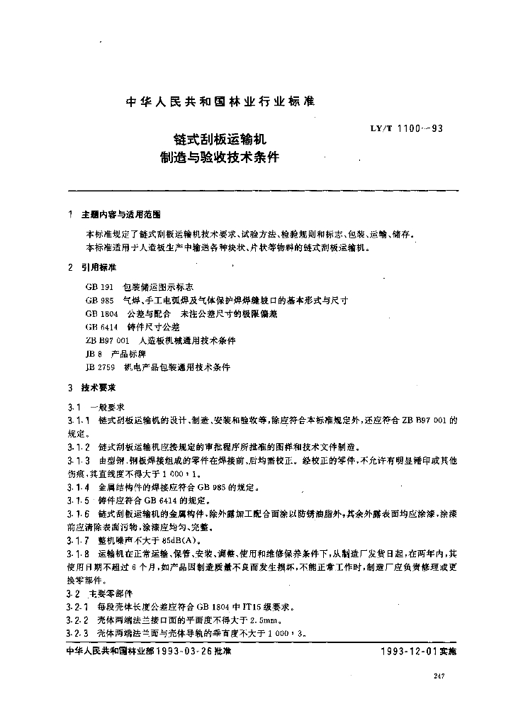 LY/T 1100-1993 链式刮板运输机 制造与验收技术条件